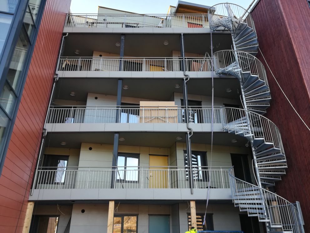 Innore leverte og installerte varmgalvaniserte stakittrekkverk til gangbroer. I tillegg produserte og installerte vi en spiraltrapp med rekkverk i 4. etasje.