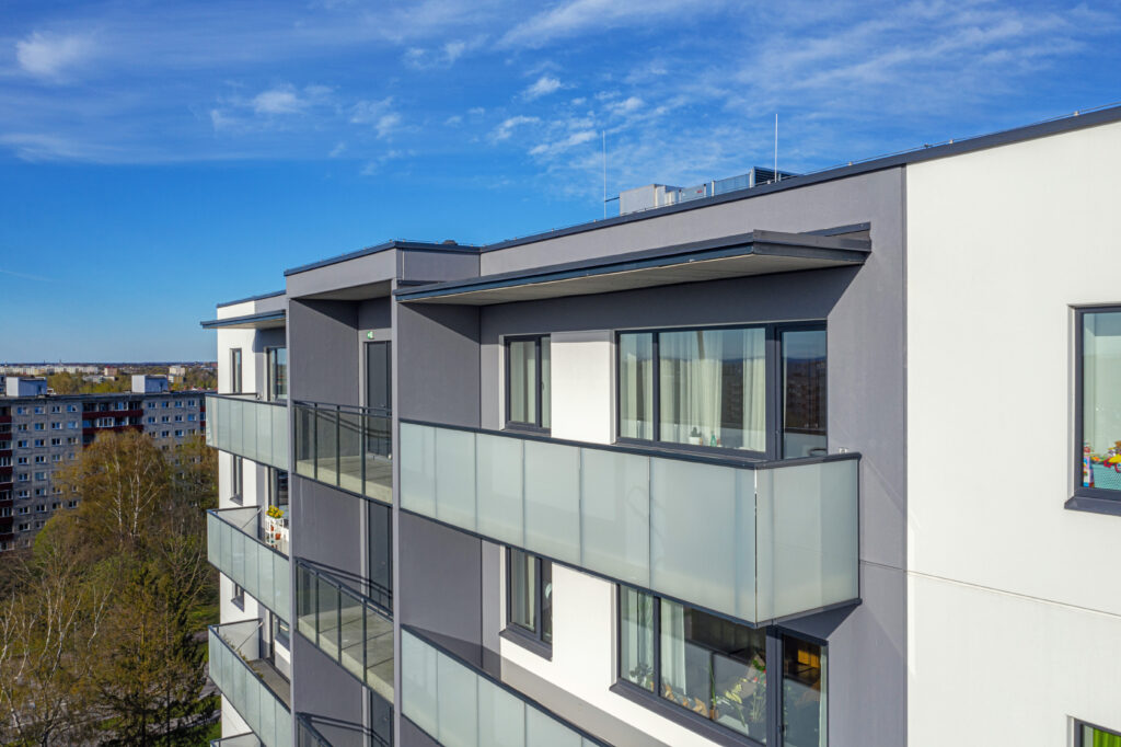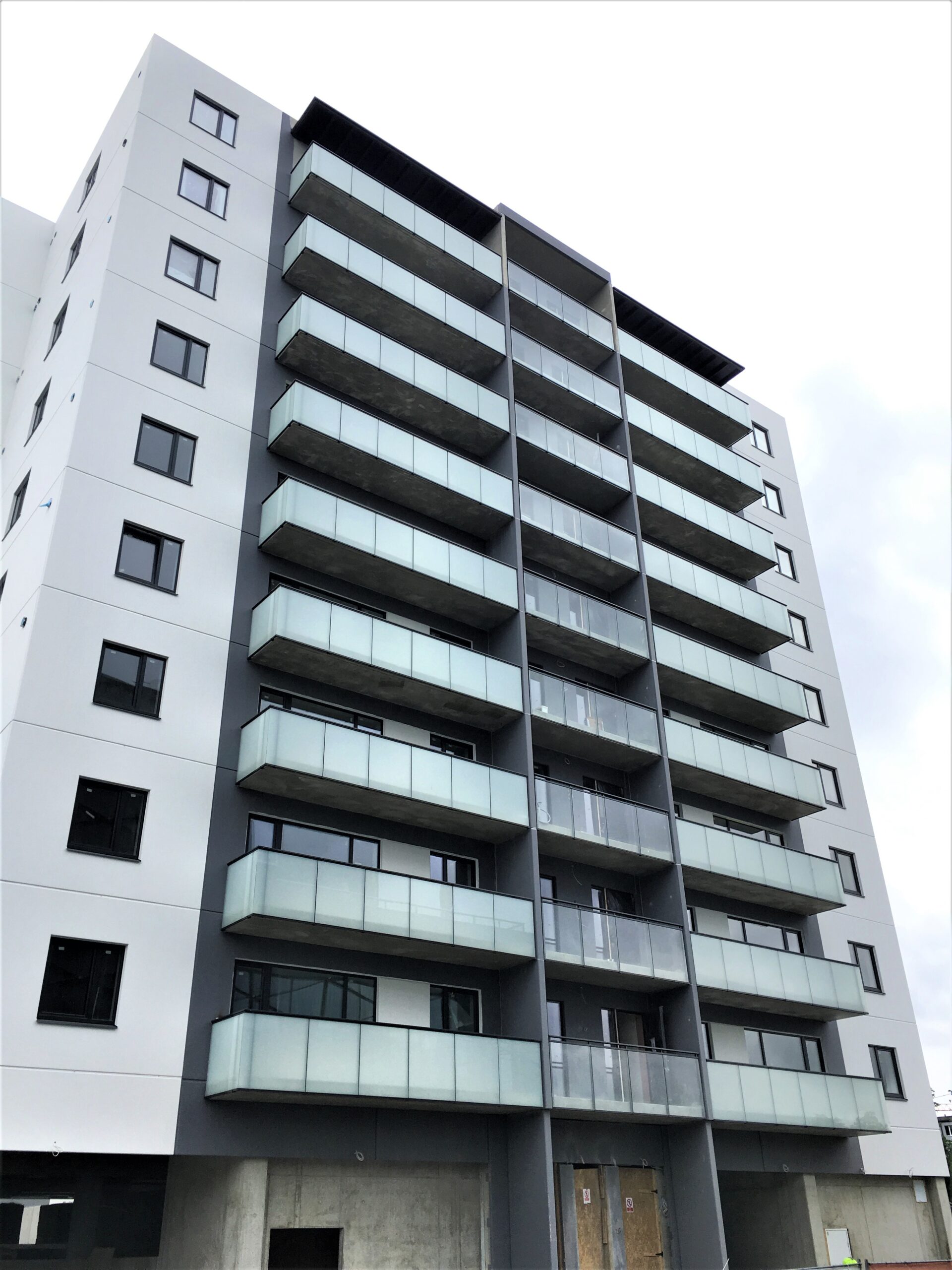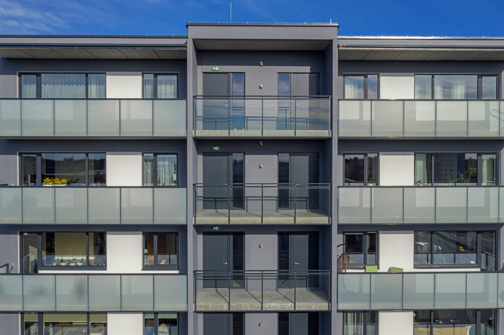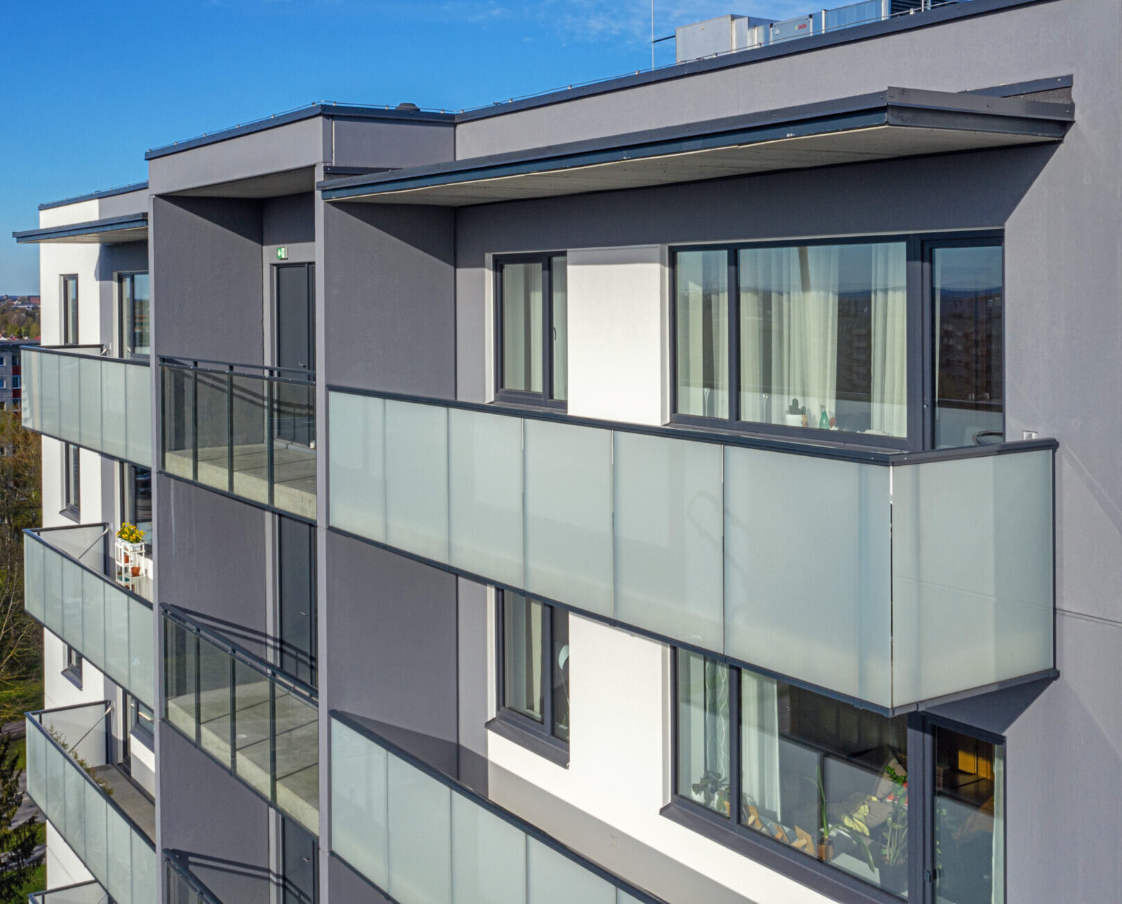 Innore leverte og installerte G-line glassrekkverk for balkonger. Denne løsningen kombinerer moderne design med forbedrede sikkerhetsfunksjoner, med glasspaneler med et melkeaktig utseende som gir både privatliv og estetisk appell.